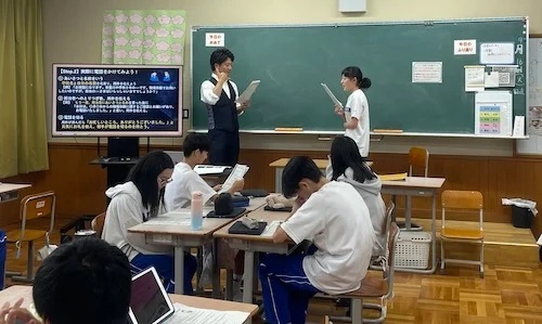 安曇川中学校では、キャリア教育の一環として地域の事業所と連携し、10月に「チャレンジウィーク(職場体験学習)」を開催している。今回は、その事前学習として同校が桑原組に「職場で必要とされるマナー・姿勢を伝えてほしい」を依頼し、取締役副社長の桑原勇人氏と高島鉱建(滋賀県高島市)の営業部課長・上原一晃氏が講師として登壇。生徒同士や教師とのペアワークを通して、自ら体験しながら学ぶ形式を取り入れ、「マナーは形ではなく、相手を思いやる気持ちである」ことを伝えることができた。