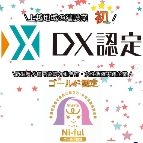 DX認定事業者は、DX推進の準備が整備されている企業を経済産業省が認める制度。同社のDX(デジタルトランスフォーメーション)が、単なるデジタル化ではなく「仲間と共に変革を起こす」取り組みであるというスタンスや、業務効率化だけでない「一人にしない組織力」で、社員が安心して挑戦できる環境を整備できた点などが評価された。上越地域の建設業では初めての認定となった。