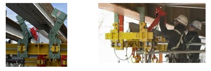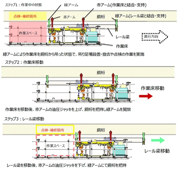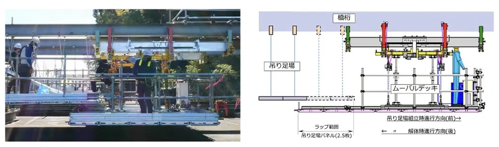 同製品は、老朽化が進む橋梁や高速道路のリニューアル、点検工事などにおいて、作業用の吊り足場を安全かつ効率的に組立・解体できる移動足場。移動機構と作業床で構成されており、作業員の安全確保と施工効率向上に貢献する。単体で橋梁点検・補修工事の作業足場としての使用もできる。