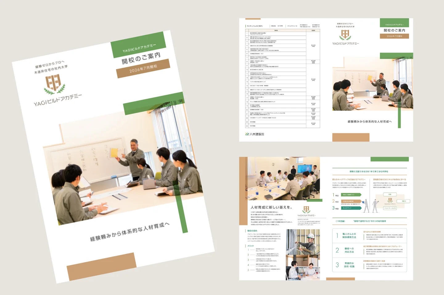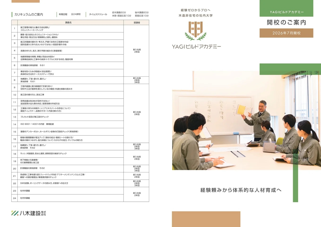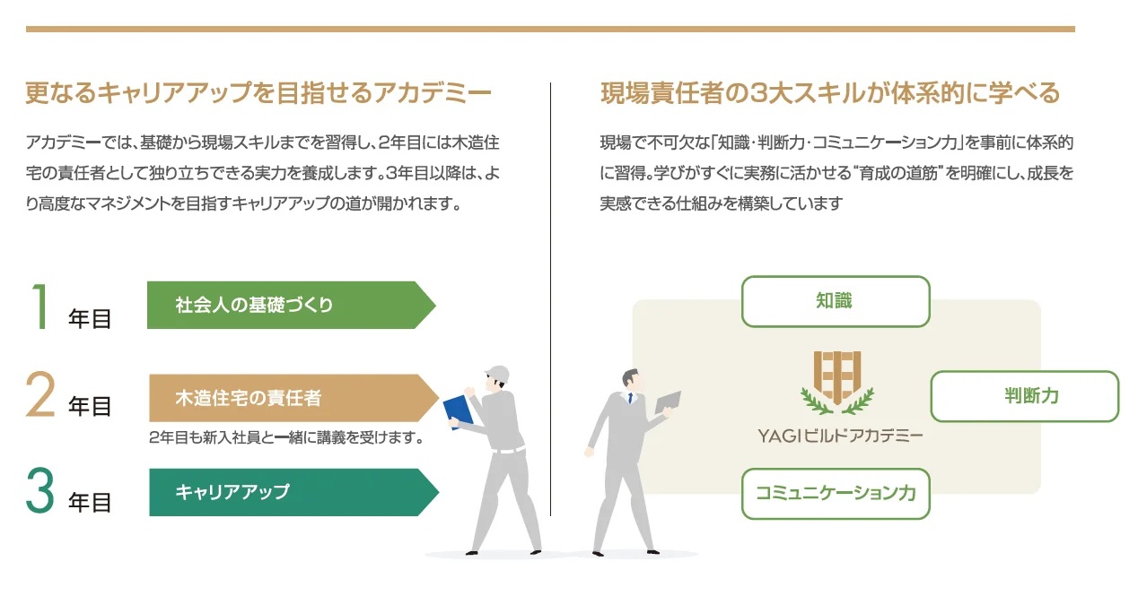 カリキュラムでは、1年目は現場で必要な基礎を体系的に学び、2年目は更地から完成するまでの流れの理解や、木造住宅の責任者としての不安を軽減する内容を盛り込んでいる。3年間は社会人として成長する期間と位置付け、キャリア形成の後押しとなる施工管理技士の資格取得も後押しをする他、同世代で横の繋がりを育み、悩みや不安を共有しやすい環境づくりも目指す。講義は主任・管理職が担当。将来的には、若手職員を講師に抜擢することで教える経験を成長に活かす機会にする狙いもある。テキスト作成には経営層も参画。社内に蓄積された知識を体系化した教材としてまとめる予定である。