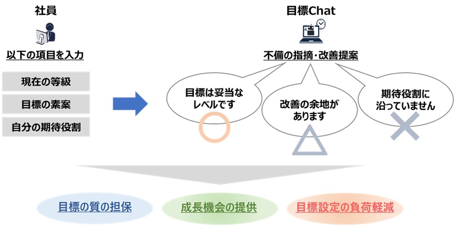 この取り組みは、社員1人ひとりの自律的な思考と言語化を支援する手段として生成AIを利用し、人材育成を加速させるために実施。矢作建設工業が2030年にあるべき姿として、「課題解決&価値創造型企業」に変わることを目的にしており、その基盤を構築するために導入を決めた。「現在の等級」「目標の素案」「自分の期待役割」を入力すると、それが現在の等級として妥当なレベルかを把握でき、改善の余地がある場合はブラッシュアップの具体例などを提示。各社員は、目標Chatが示した内容を基に、自らの改善・改良を心掛けられる体制となっている。
